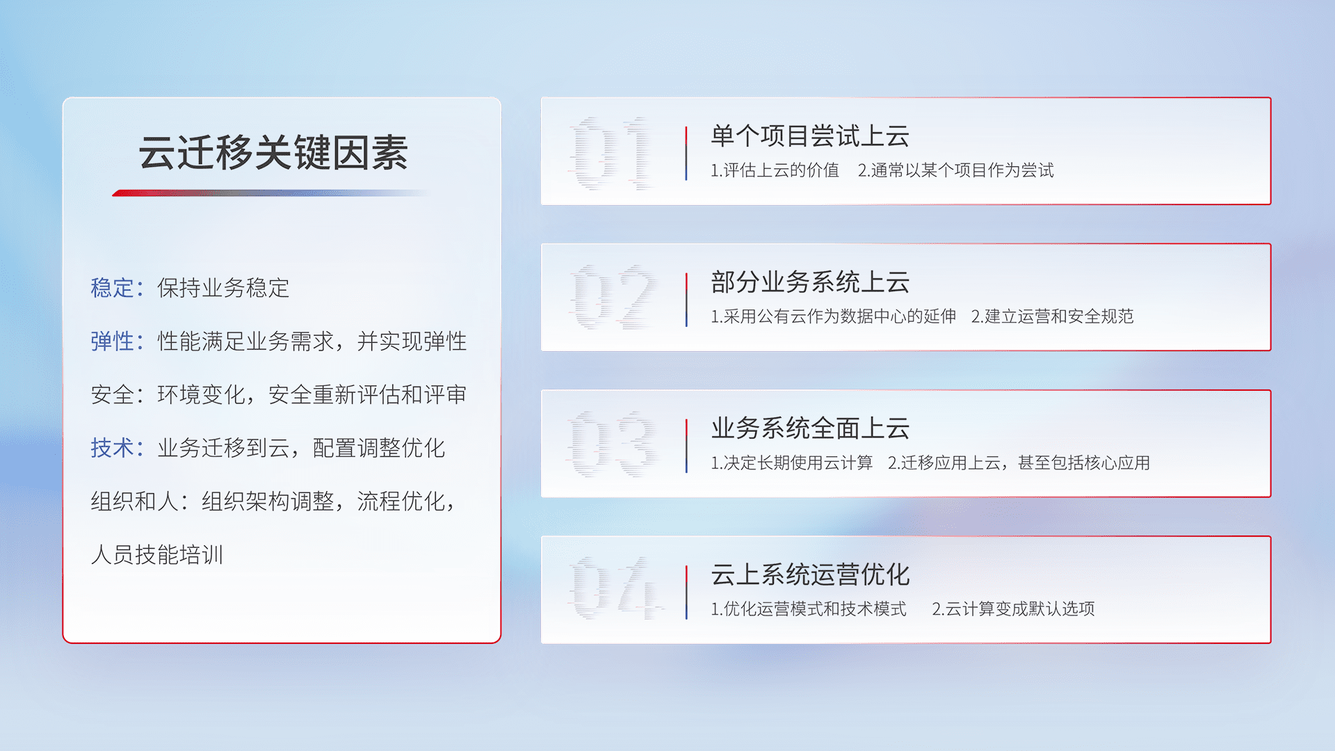 结合实际业务,,,,从规划设计、、云平台选型、、、云原生改造、、数据迁移、、集成交付,,,迁移全过程为客户识别最佳上云路径,,做好风险识别管理,,设计网络架构、、身份权限、、安全审计合规、、、、操作审计、、、日志审计、、、、监控告警策略、、、、多站点容灾设计等,,,对云上基础设施进行整体规划,,,提升IT治理水平,,,以满足弹性、、、、高可用、、高性能的需求。。。
