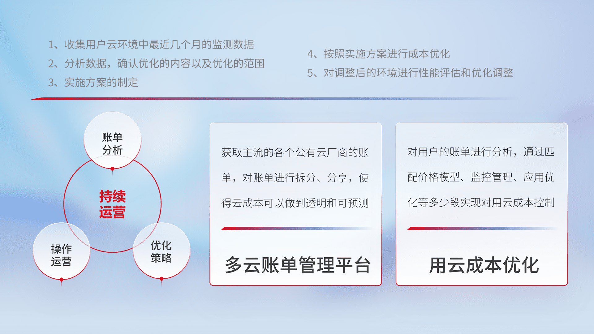 通过多云纳管,,,以统一的资源数据模型把客户的云资源进行抽象和封装,,,进而实现对多云资源的统一操作,,,保障云资源管理的可靠性、、、稳定性与可用性。。。。量身定制化运维内容,,配置、、、开发运维、、、、补丁管理、、、备份、、、、监控、、认证和访问管理、、审计和日常巡检等,,,,保障在用云过程中的可靠度,,稳定度以及高可用率。。。